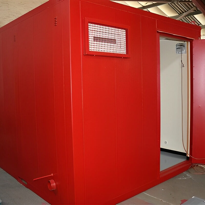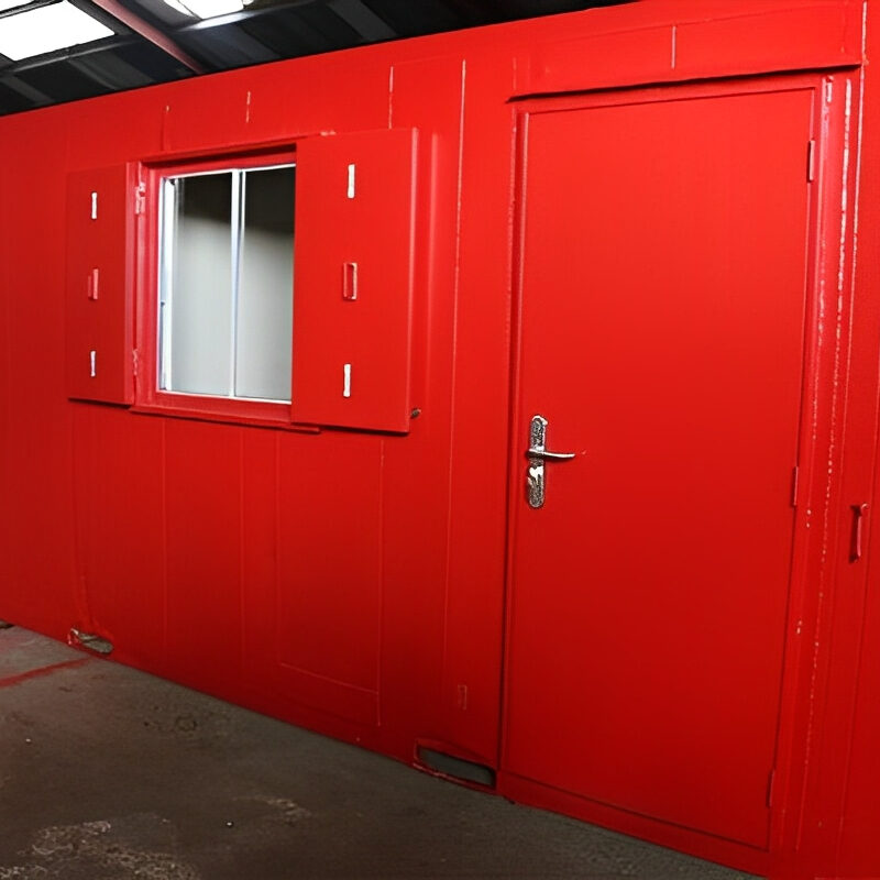 Diese aus robustem Flachstahl gefertigte   Bürokabine bietet optimalen Schutz vor Vandalismus und verfügt über einen  separaten Arbeitsbereich sowie eine separate Toilette  mit jeweils eigenem, gesicherten Eingang. Die leuchtend  rote Lackierung  sorgt für gute Sichtbarkeit auf stark frequentierten Baustellen und verleiht der Kabine ein modernes, ansprechendes Aussehen.